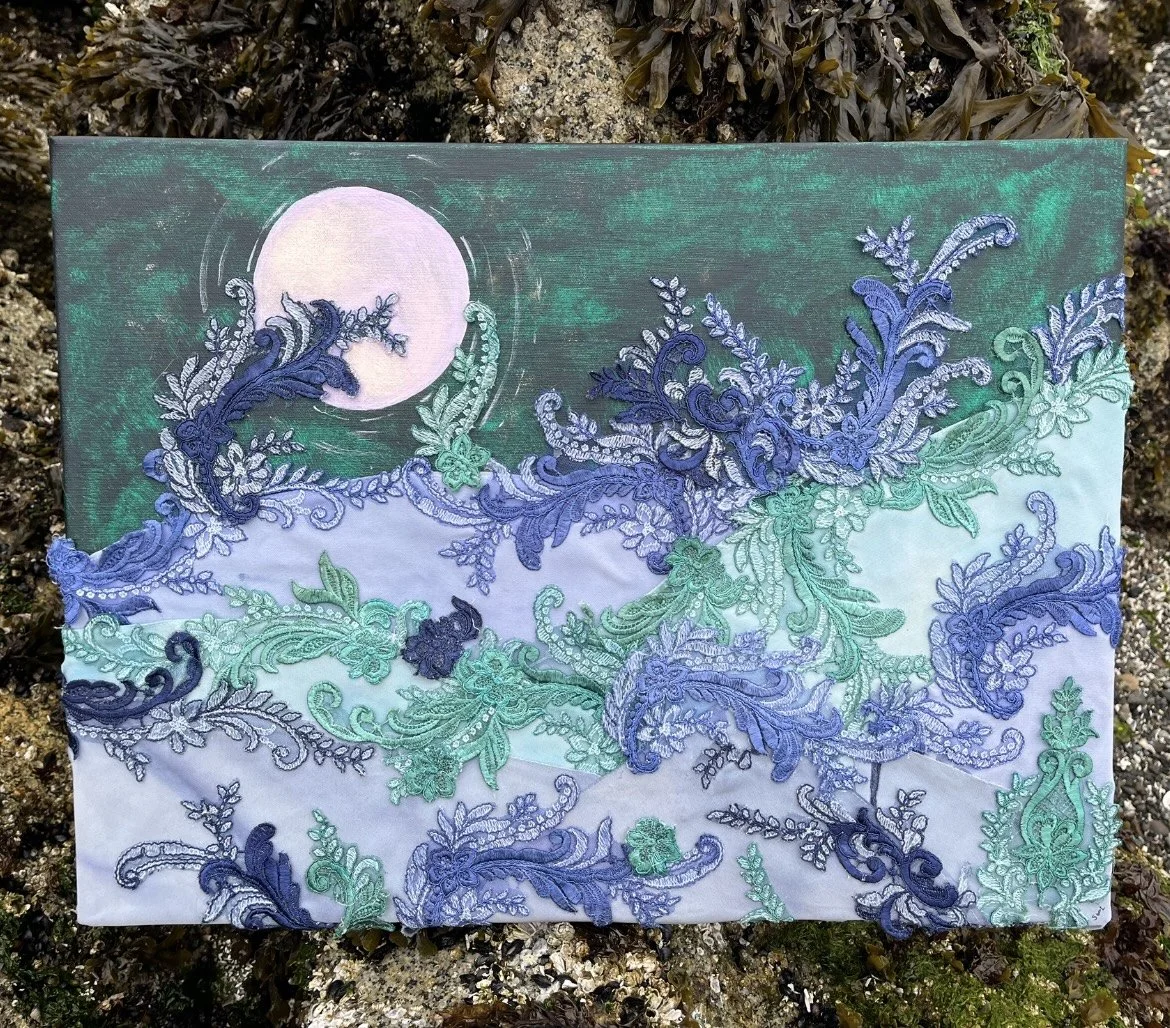 Fabric, acrylic, powdered pigment on canvas | Deconstructed wedding dress explores themes of grief, renewal, and transformation after loss.